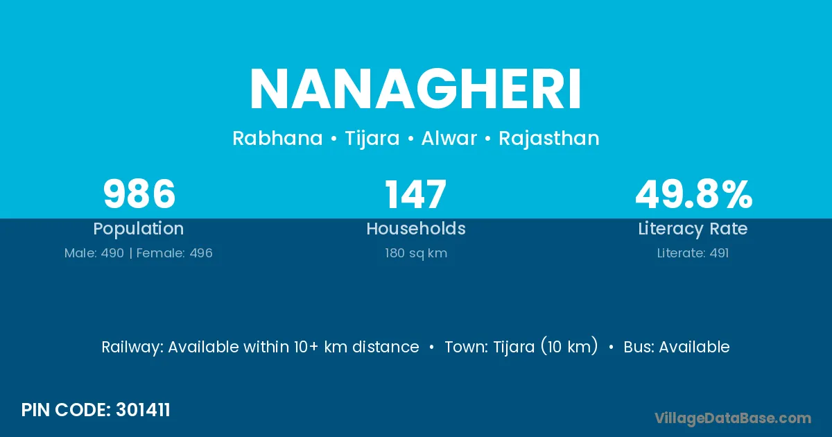 Tijara (10 km) is the nearest town to Nanagheri village for major economic activities and is located approximately 10 km away.