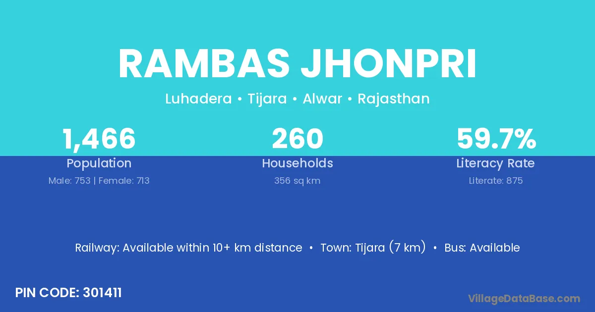 Tijara (7 km) is the nearest town to Rambas Jhonpri village for major economic activities and is located approximately 7 km away.