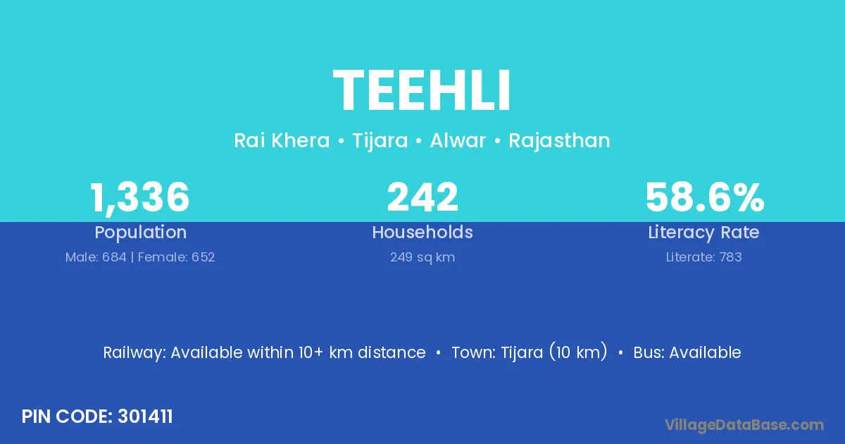 Tijara (10 km) is the nearest town to Teehli village for major economic activities and is located approximately 10 km away.