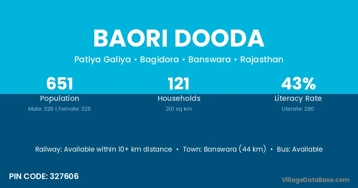 Banswara (44 km) is the nearest town to Baori Dooda village for major economic activities and is located approximately 44 km away.