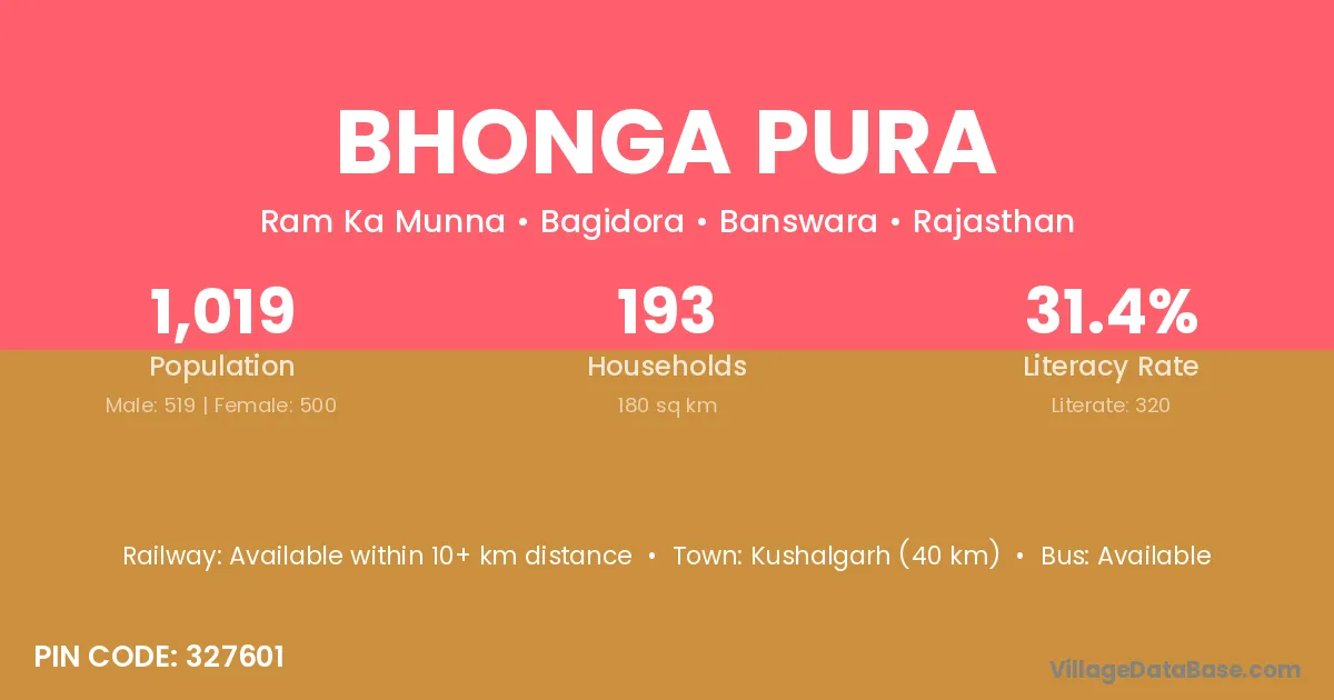Kushalgarh (40 km) is the nearest town to Bhonga Pura village for major economic activities and is located approximately 40 km away.