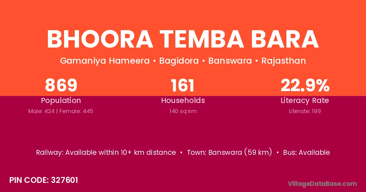 Bhoora Temba Bara village has a total population of 869 people, of which 424 are males and 445 are females.