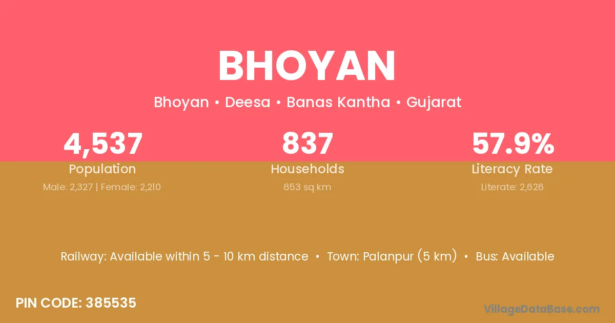 Bhoyan village has a total population of 853 people, of which 436 are males and 417 are females.