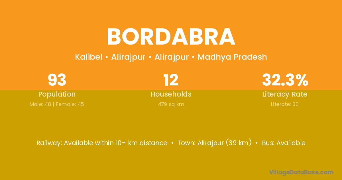 Jhalod (20 km) is the nearest town to Bordabra village for major economic activities and is located approximately 20 km away.