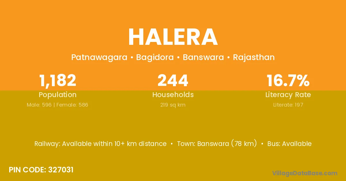 Banswara (78 km) is the nearest town to Halera village for major economic activities and is located approximately 78 km away.