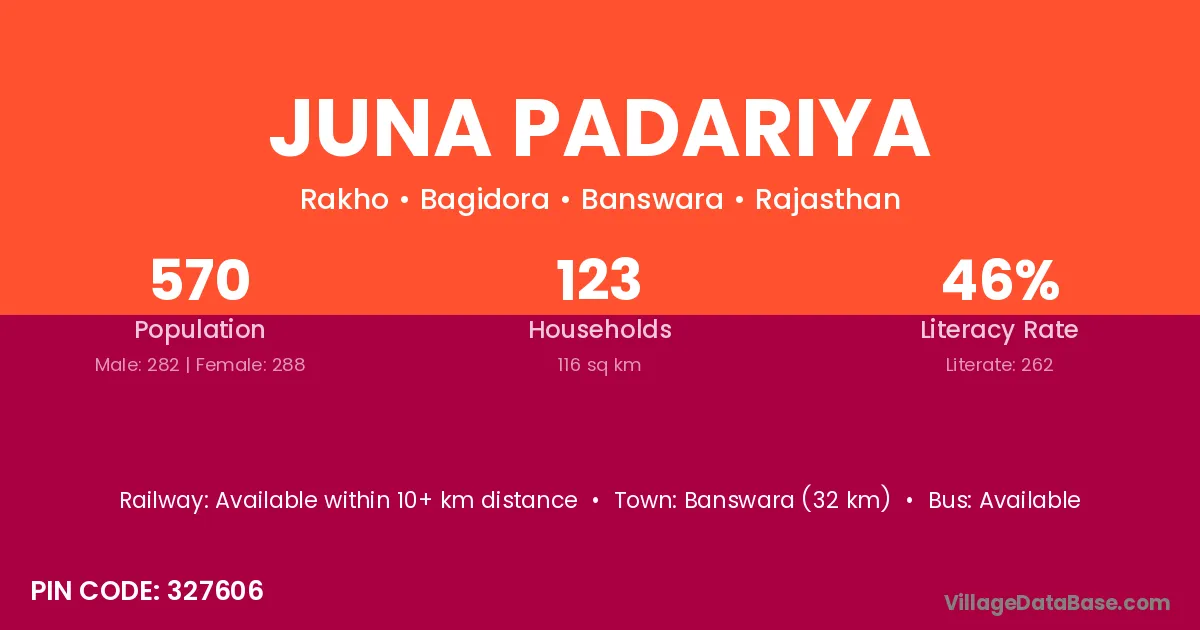 Banswara (32 km) is the nearest town to Juna Padariya village for major economic activities and is located approximately 32 km away.