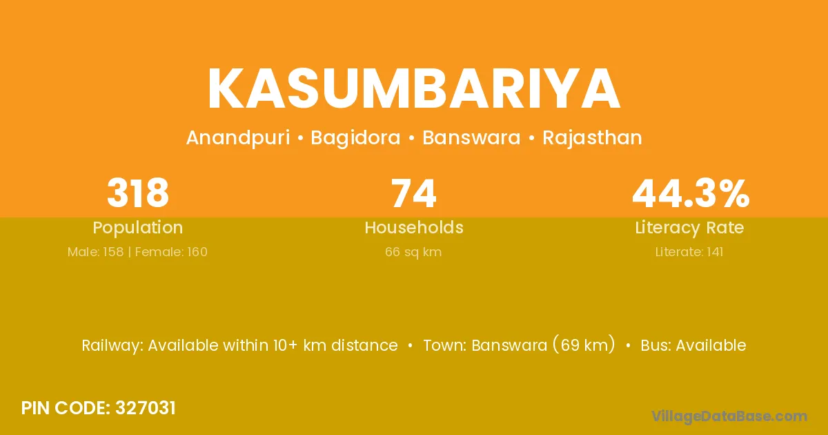 Banswara (69 km) is the nearest town to Kasumbariya village for major economic activities and is located approximately 69 km away.
