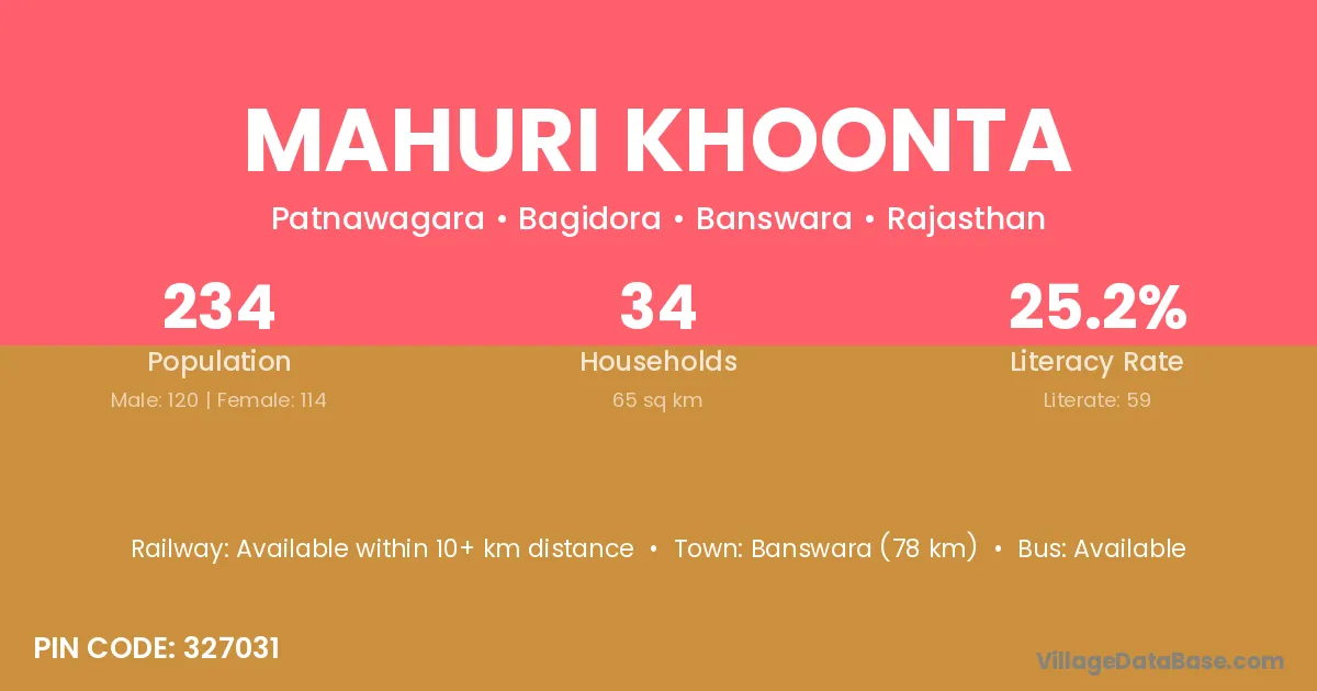 Banswara (78 km) is the nearest town to Mahuri Khoonta village for major economic activities and is located approximately 78 km away.