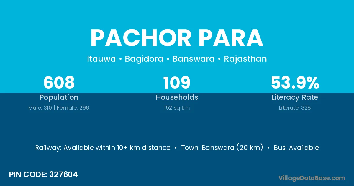 Banswara (20 km) is the nearest town to Pachor Para village for major economic activities and is located approximately 20 km away.