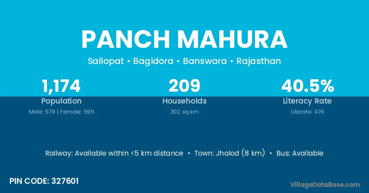 Jhalod (8 km) is the nearest town to Panch Mahura village for major economic activities and is located approximately 8 km away.