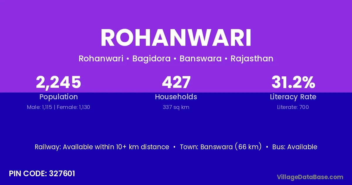 Banswara (66 km) is the nearest town to Rohanwari village for major economic activities and is located approximately 66 km away.