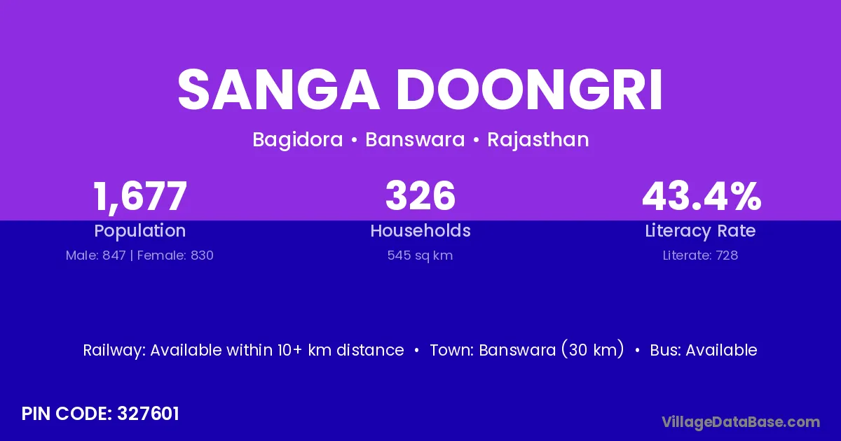 Banswara (30 km) is the nearest town to Sanga Doongri village for major economic activities and is located approximately 30 km away.