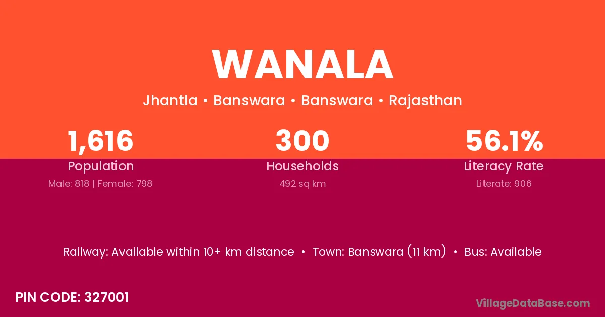 Banswara (11 km) is the nearest town to Wanala village for major economic activities and is located approximately 11 km away.