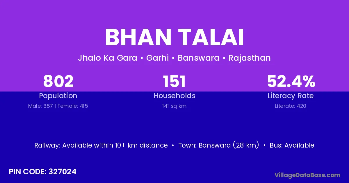 Banswara (28 km) is the nearest town to Bhan Talai village for major economic activities and is located approximately 28 km away.