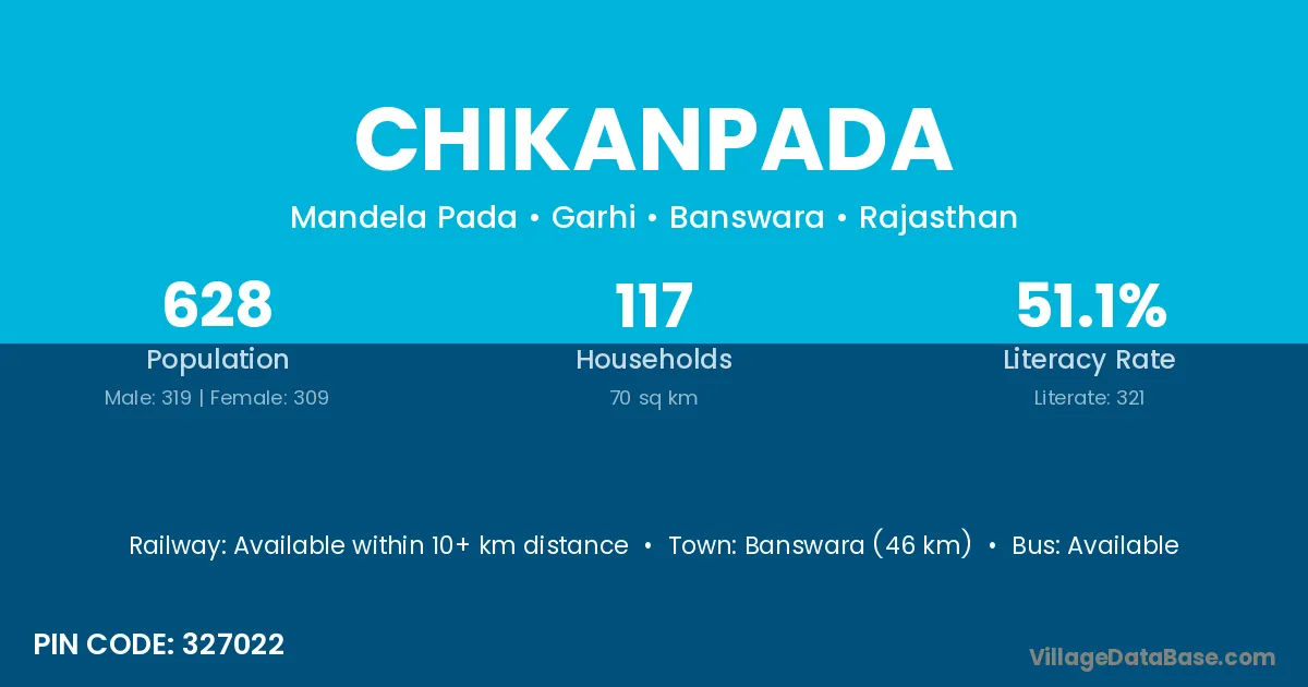 Banswara (46 km) is the nearest town to Chikanpada village for major economic activities and is located approximately 46 km away.