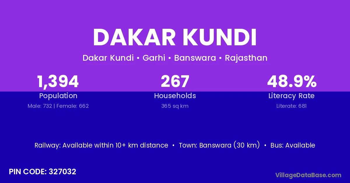 Banswara (30 km) is the nearest town to Dakar Kundi village for major economic activities and is located approximately 30 km away.