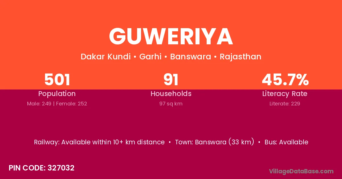 Banswara (33 km) is the nearest town to Guweriya village for major economic activities and is located approximately 33 km away.