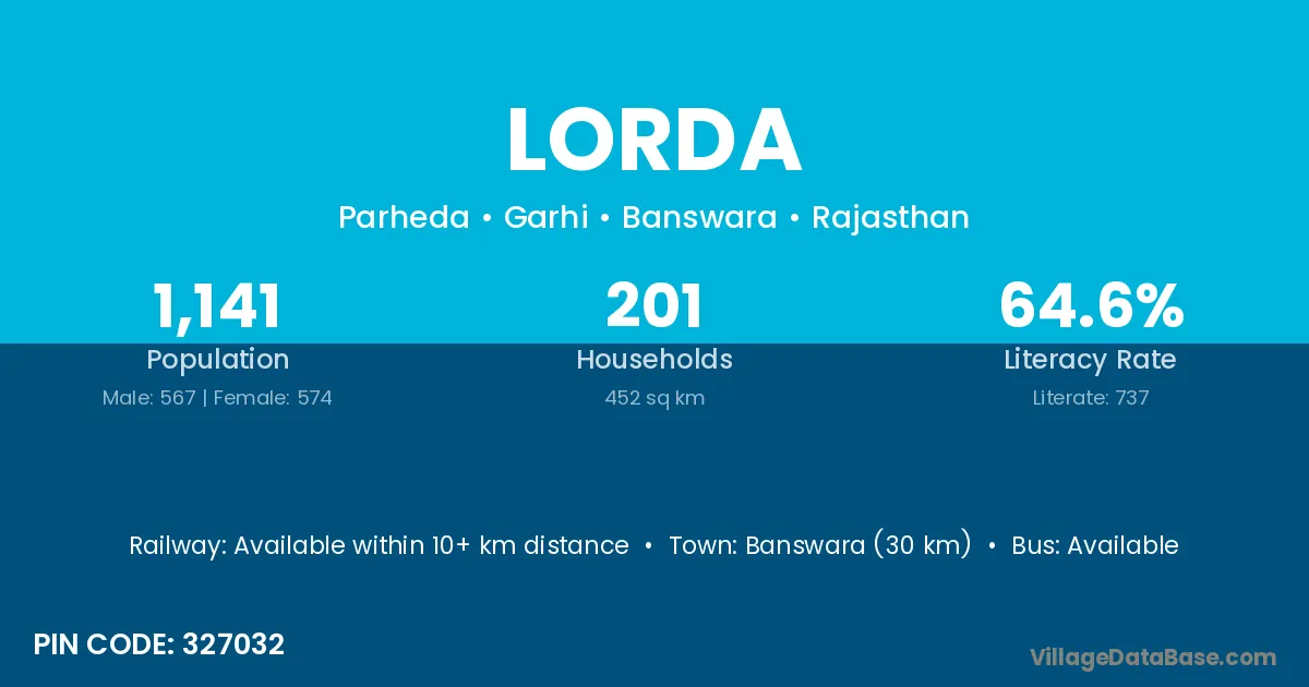 Banswara (30 km) is the nearest town to Lorda village for major economic activities and is located approximately 30 km away.