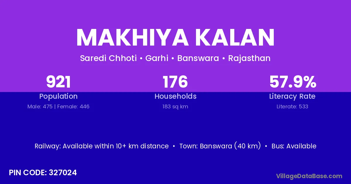 Banswara (40 km) is the nearest town to Makhiya Kalan village for major economic activities and is located approximately 40 km away.