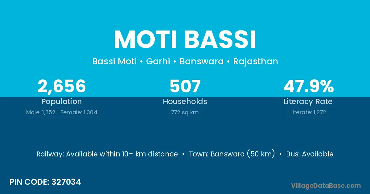Banswara (50 km) is the nearest town to Moti Bassi village for major economic activities and is located approximately 50 km away.