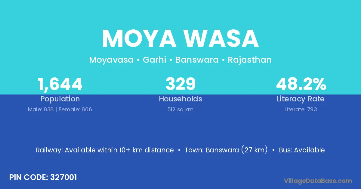 Banswara (27 km) is the nearest town to Moya Wasa village for major economic activities and is located approximately 27 km away.