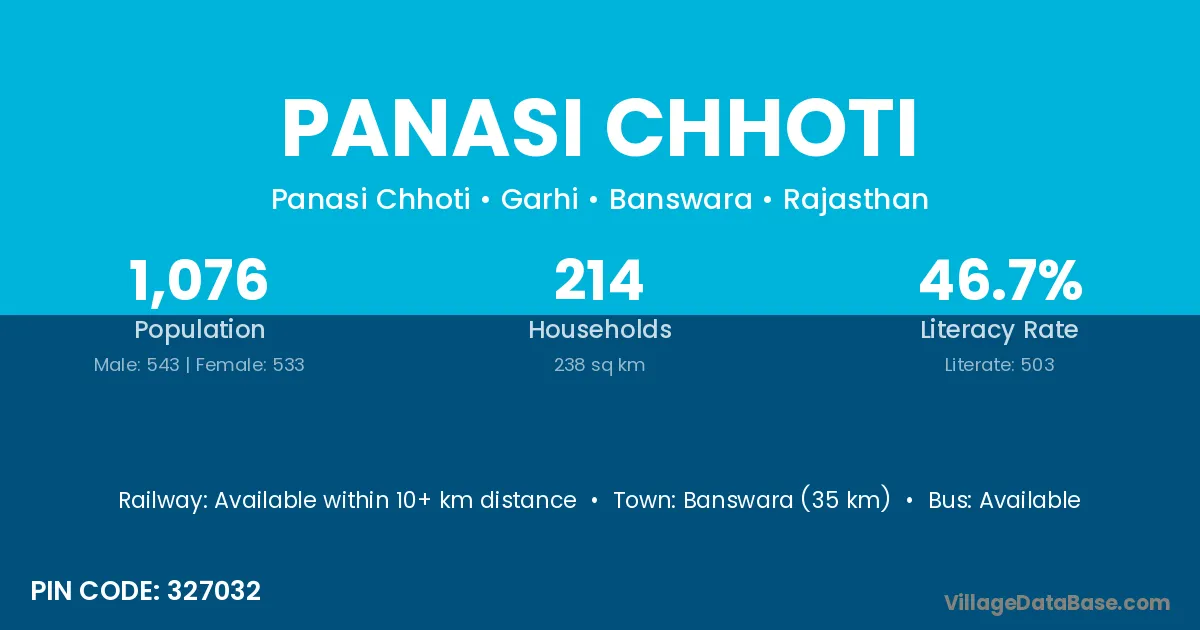Banswara (35 km) is the nearest town to Panasi Chhoti village for major economic activities and is located approximately 35 km away.