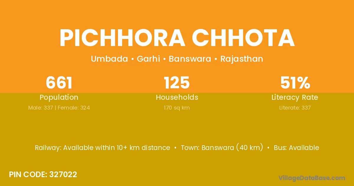 Banswara (40 km) is the nearest town to Pichhora Chhota village for major economic activities and is located approximately 40 km away.