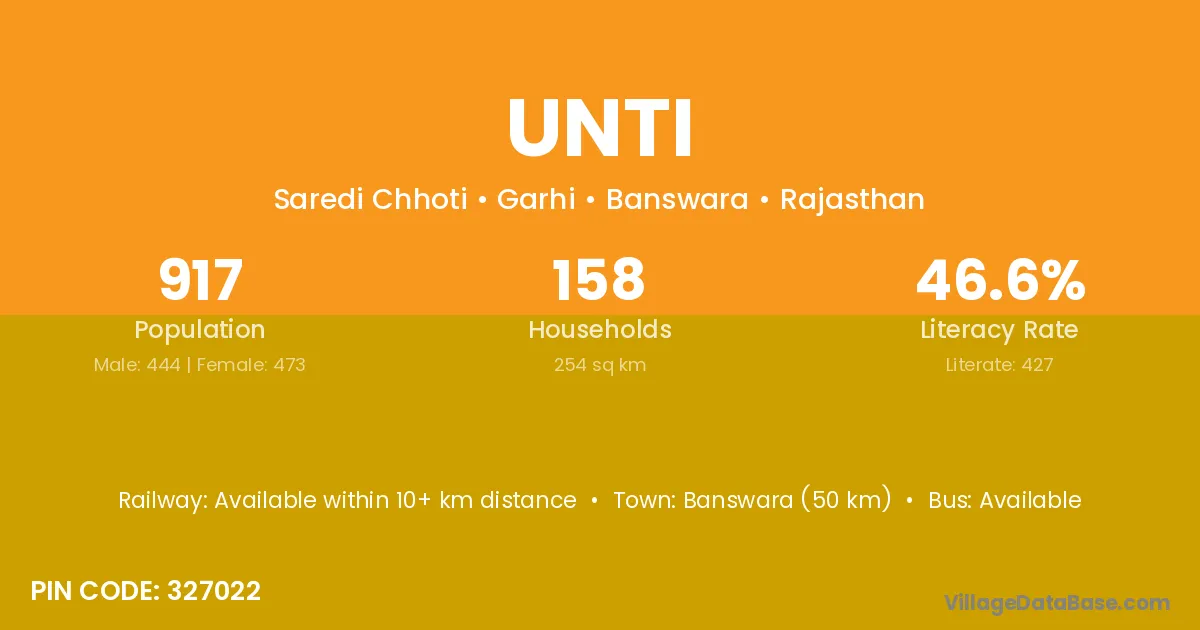 Banswara (50 km) is the nearest town to Unti village for major economic activities and is located approximately 50 km away.