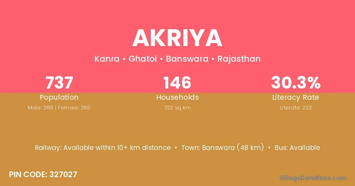 Banswara (48 km) is the nearest town to Akriya village for major economic activities and is located approximately 48 km away.