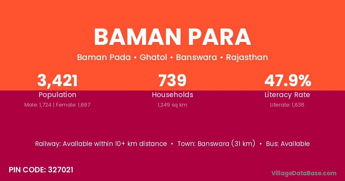 Banswara (31 km) is the nearest town to Baman Para village for major economic activities and is located approximately 31 km away.