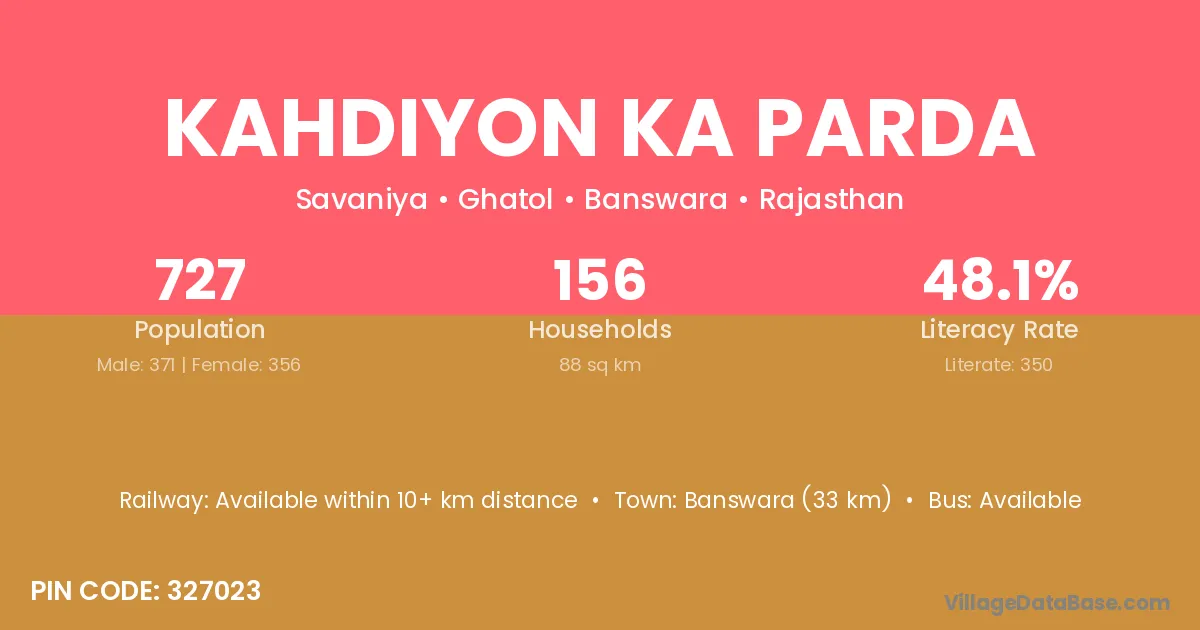 Banswara (33 km) is the nearest town to Kahdiyon Ka Parda village for major economic activities and is located approximately 33 km away.