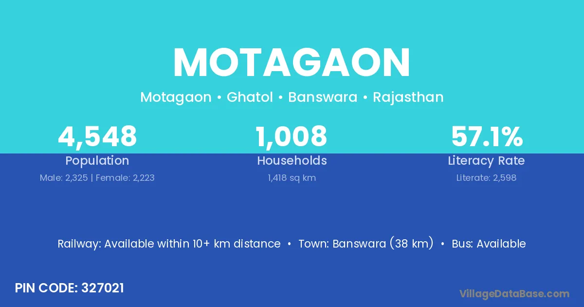 Banswara (38 km) is the nearest town to Motagaon village for major economic activities and is located approximately 38 km away.