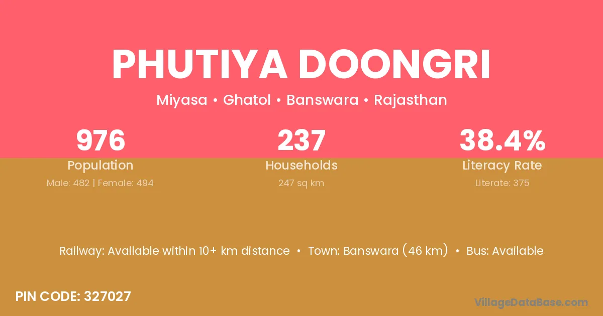 Banswara (46 km) is the nearest town to Phutiya Doongri village for major economic activities and is located approximately 46 km away.