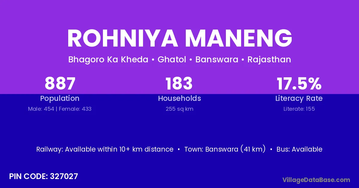 Banswara (41 km) is the nearest town to Rohniya Maneng village for major economic activities and is located approximately 41 km away.