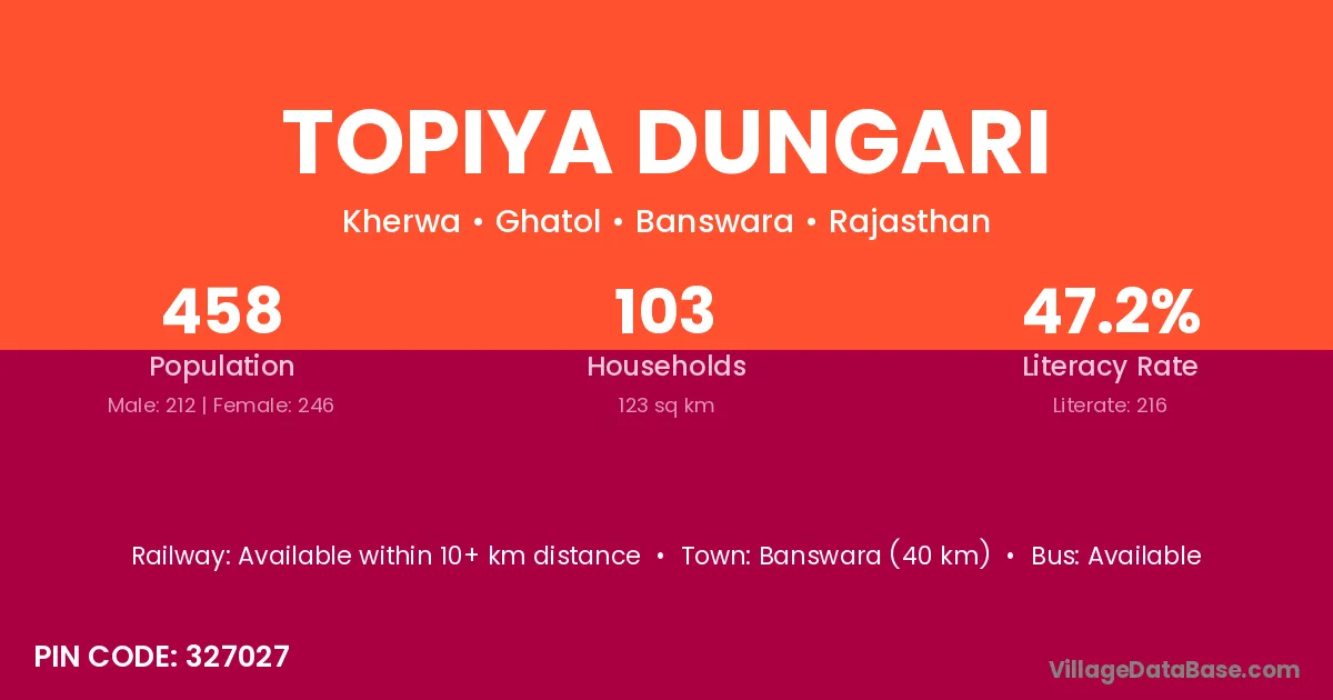 Banswara (40 km) is the nearest town to Topiya Dungari village for major economic activities and is located approximately 40 km away.