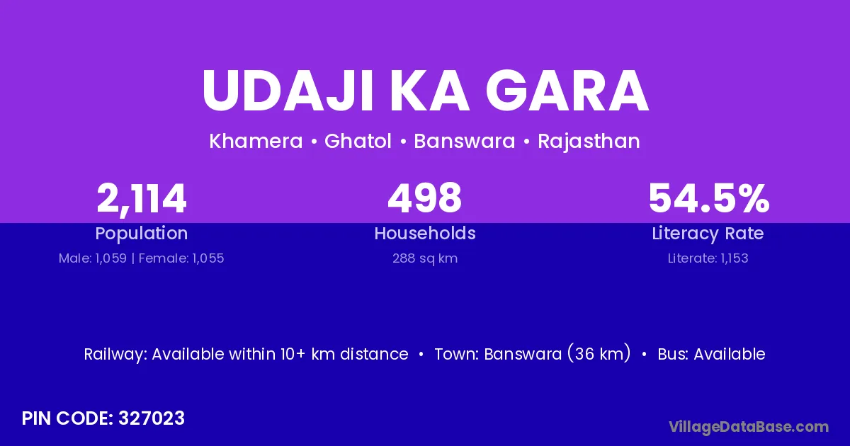 Udaji Ka Gara village has a total population of 2,114 people, of which 1,059 are males and 1,055 are females.