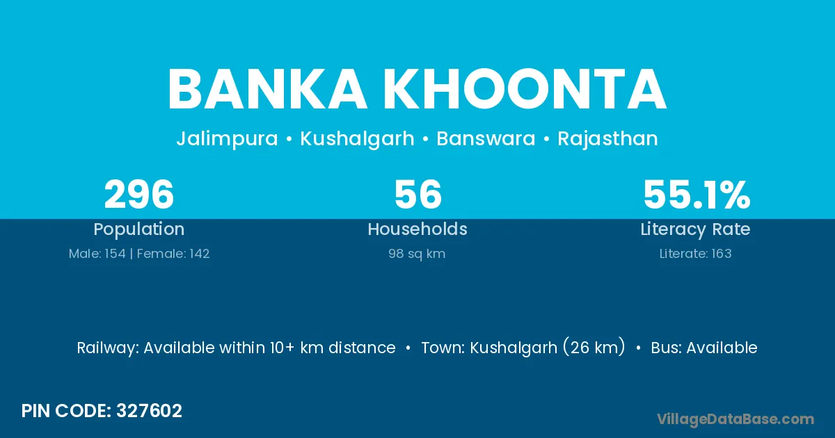 Kushalgarh (26 km) is the nearest town to Banka Khoonta village for major economic activities and is located approximately 26 km away.