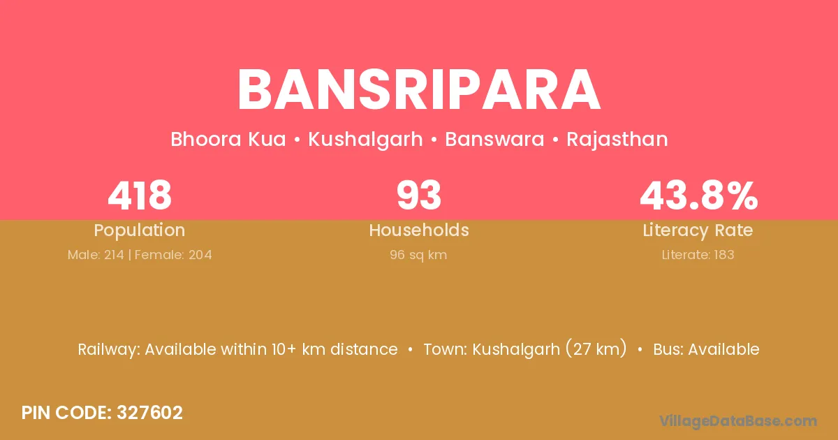 Kushalgarh (27 km) is the nearest town to Bansripara village for major economic activities and is located approximately 27 km away.