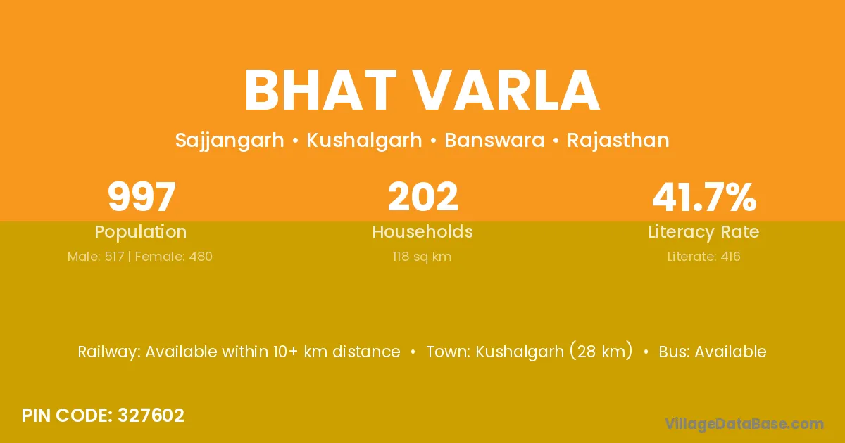 Kushalgarh (28 km) is the nearest town to Bhat Varla village for major economic activities and is located approximately 28 km away.
