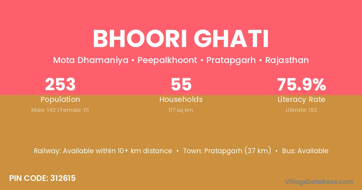 Kushalgarh (35 km) is the nearest town to Bhoori Ghati village for major economic activities and is located approximately 35 km away.