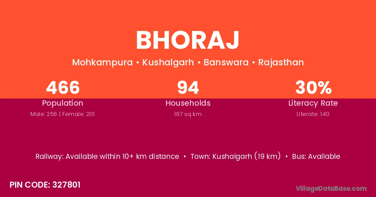 Kushalgarh (19 km) is the nearest town to Bhoraj village for major economic activities and is located approximately 19 km away.