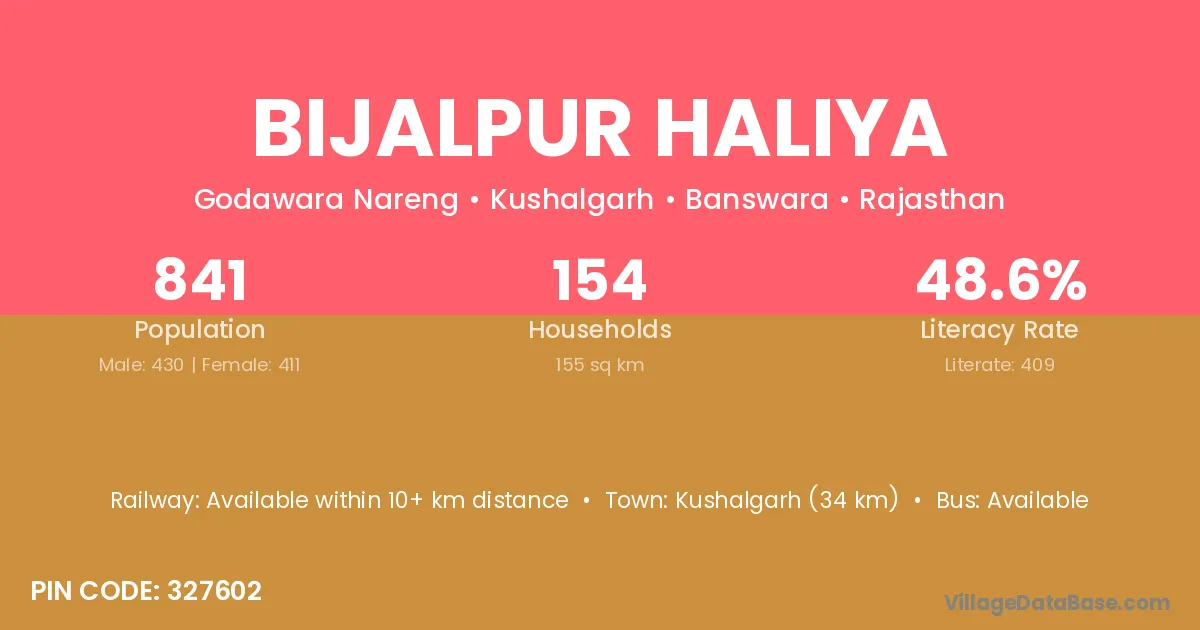 Kushalgarh (34 km) is the nearest town to Bijalpur Haliya village for major economic activities and is located approximately 34 km away.
