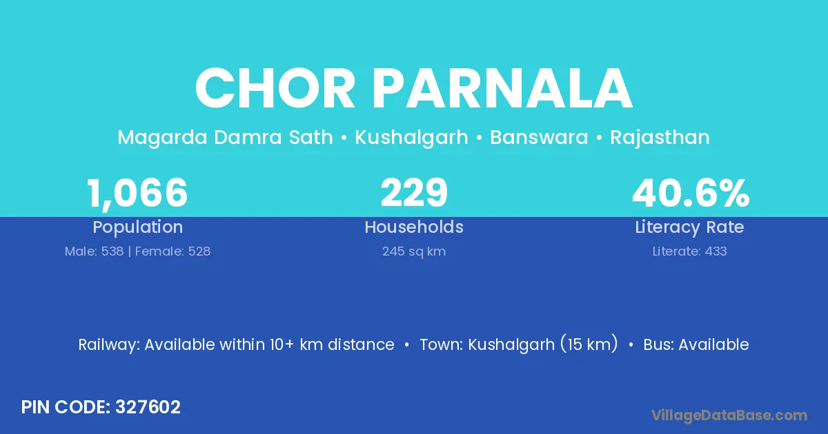 Kushalgarh (15 km) is the nearest town to Chor Parnala village for major economic activities and is located approximately 15 km away.