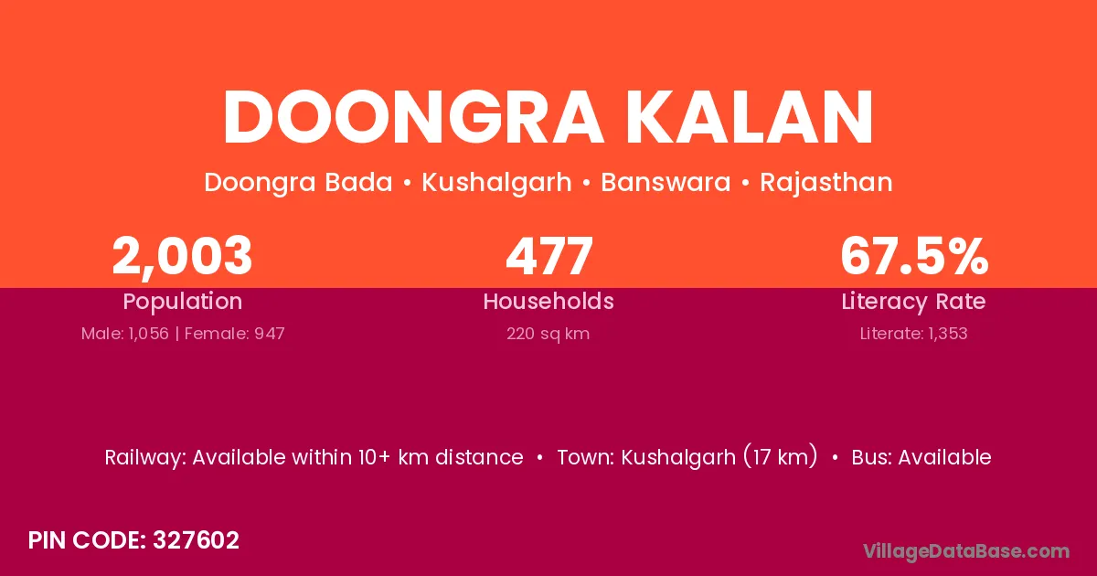Kushalgarh (17 km) is the nearest town to Doongra Kalan village for major economic activities and is located approximately 17 km away.
