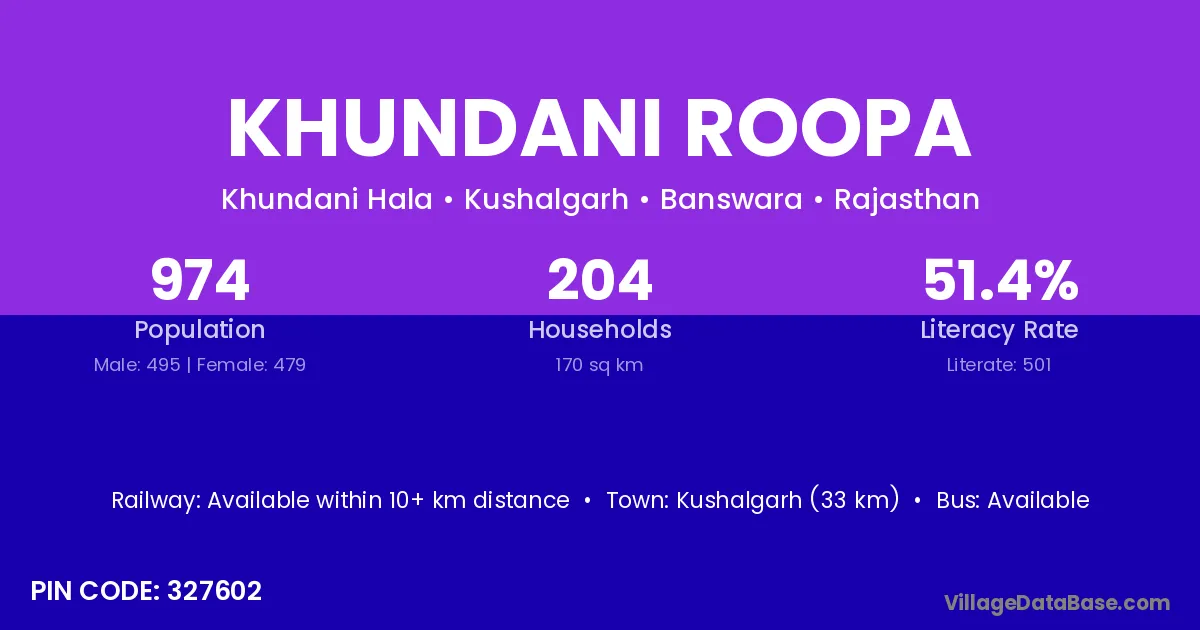 Kushalgarh (33 km) is the nearest town to Khundani Roopa village for major economic activities and is located approximately 33 km away.