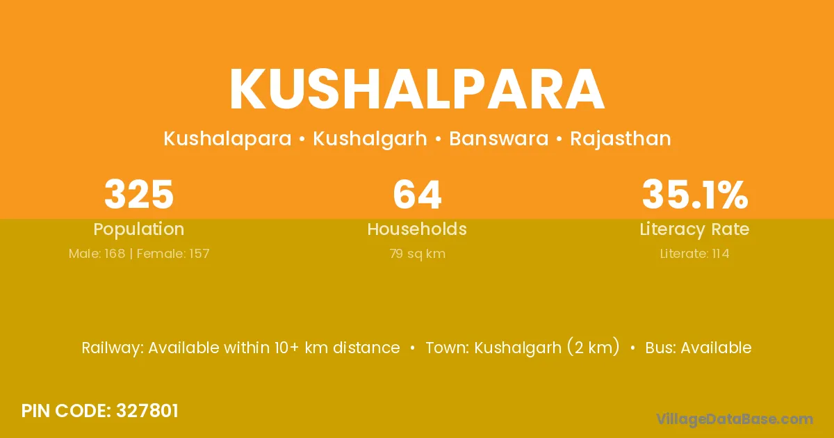 Kushalgarh (2 km) is the nearest town to Kushalpara village for major economic activities and is located approximately 2 km away.