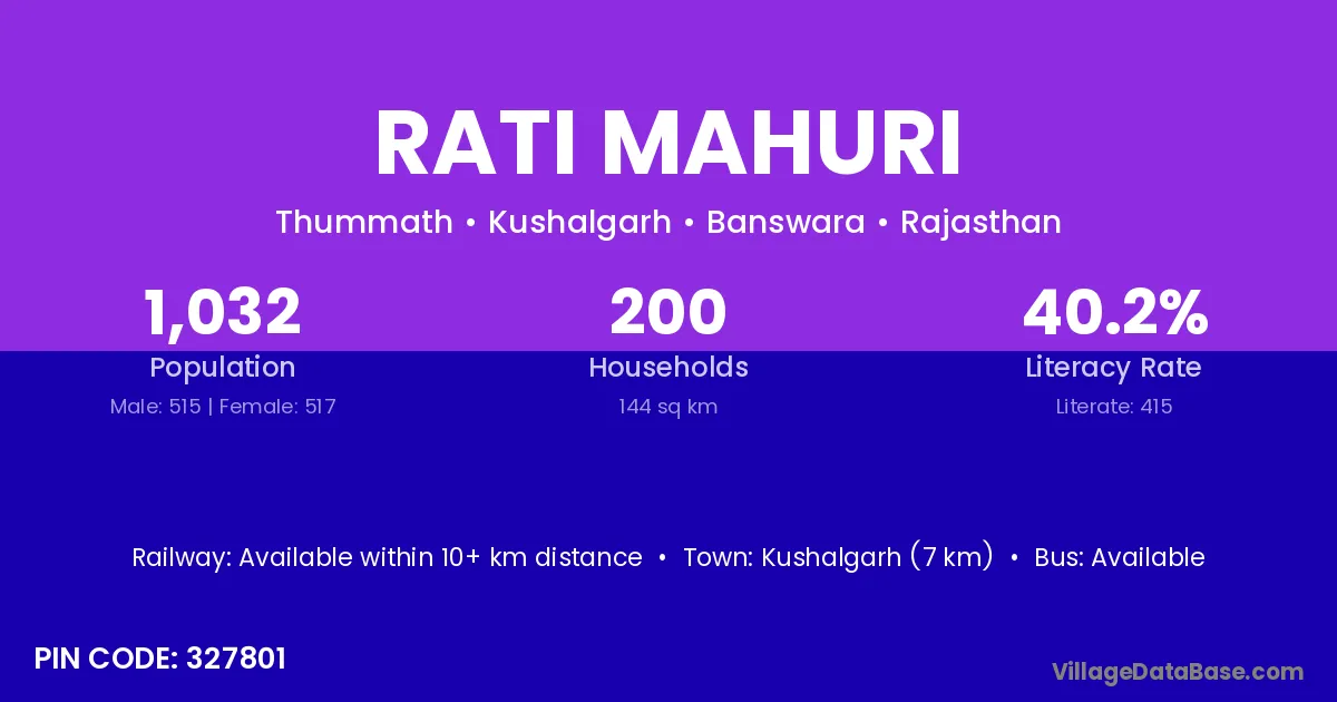 Kushalgarh (7 km) is the nearest town to Rati Mahuri village for major economic activities and is located approximately 7 km away.