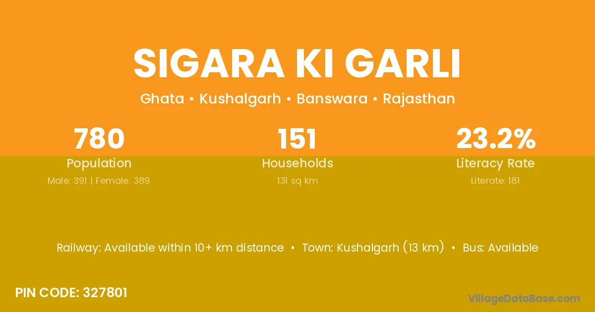 Kushalgarh (13 km) is the nearest town to Sigara Ki Garli village for major economic activities and is located approximately 13 km away.