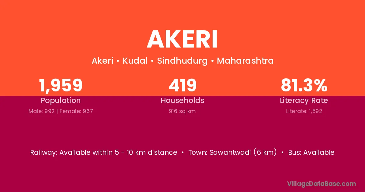 The literacy rate of Akeri village is 66.41%. Male literacy stands at 78.44% and female literacy at 53.41%.