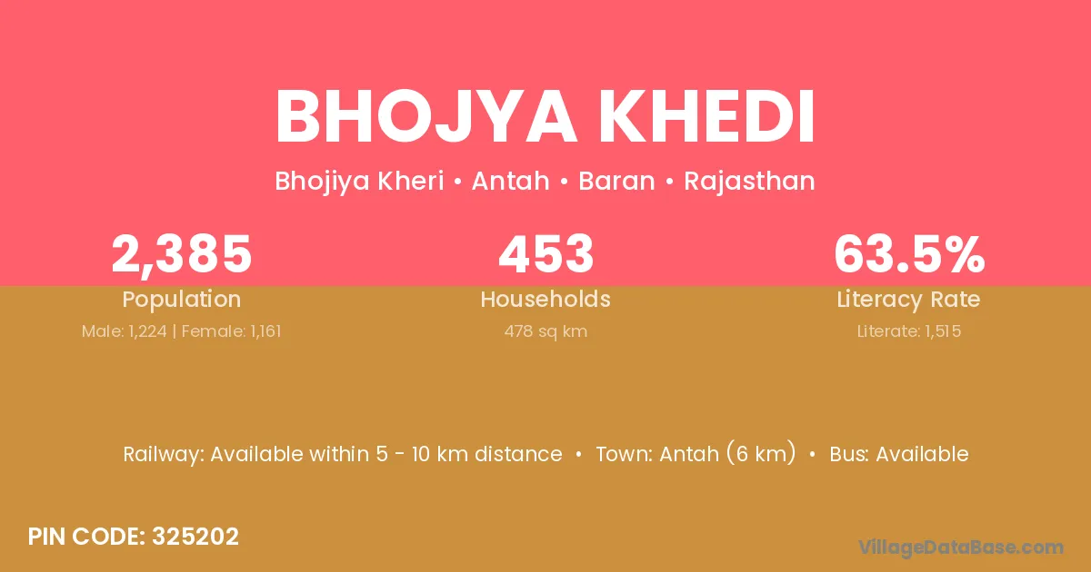 Antah (6 km) is the nearest town to Bhojya Khedi village for major economic activities and is located approximately 6 km away.